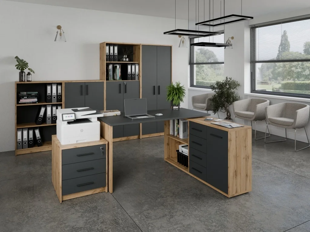 Praktická a funkční kancelářská sestava představuje promyšlený systém pro uspořádaný pracovní prostor s reprezentativním vzhledem. Je koncipovaná jako modulární celek, který si díky variabilní konfiguraci složíte podle svých potřeb.