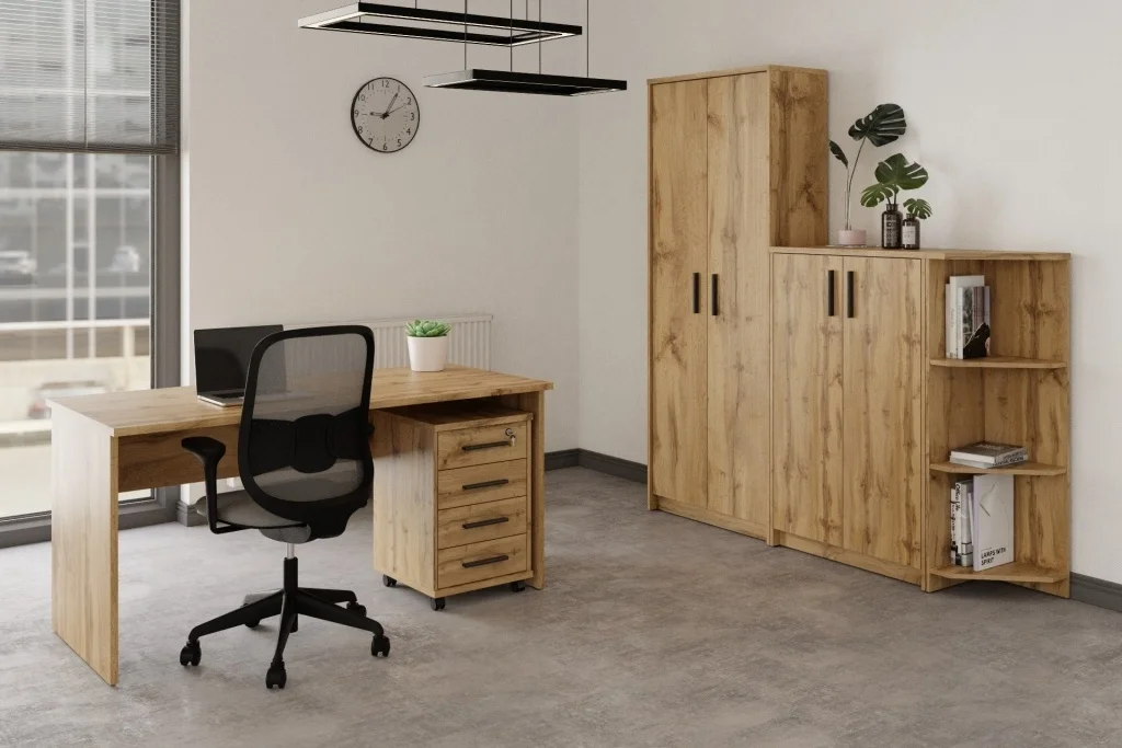 Kancelářský systém NEJBY GIANNI 5 v dekoru dub wotan nabízí prakticky uspořádaný a přitom reprezentativní pracovní prostor. Modulární konstrukce dovoluje díly libovolně kombinovat a nastavit podle dispozic vašeho interiéru. Sestava obsahuje: rohový nízký regál (34 x 116 x 34 cm), pracovní stůl (148 x 74 x 68 cm), skříňku (73 x 116 x 34 cm), uzamykatelný kontejner (38 x 62 x 42 cm) a skříňku se čtyřmi policemi (73 x 187 x 34 cm). Povrch materiálu je lamino, odolný vůči běžnému provozu a snadno se čistí. Dodáváno v demontu.