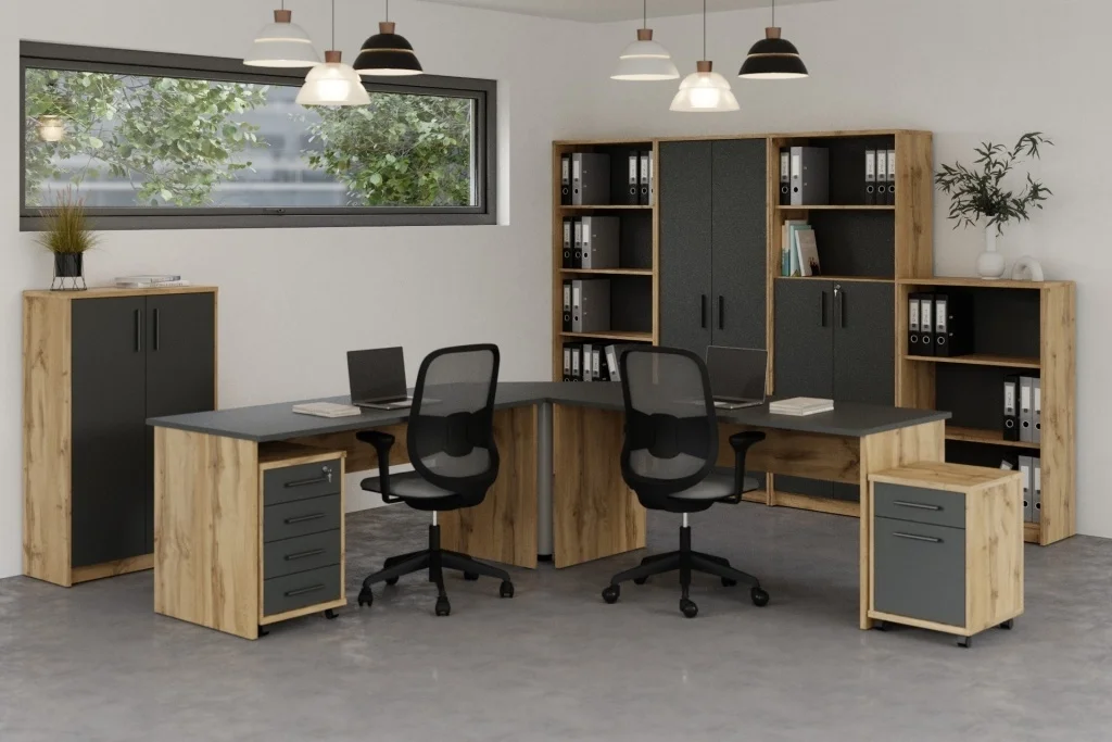 Modulární kancelářská sestava NEJBY GIANNI 6 v dekoru dub wotan/antracit přináší efektivní organizaci a reprezentativní vzhled. Díky flexibilní konstrukci lze jednotlivé prvky volně kombinovat podle dispozic vaší kanceláře.