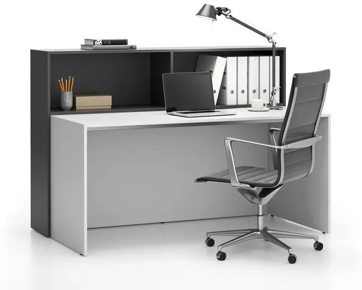 Vyrobený z odolné laminované dřevotřísky o tloušťce 18 mm, nabízí pevnost a dlouhou životnost. Pracovní stůl je vybaven otvory s krytkami pro snadné vedení kabelů a spodní výztuhou pro zvýšenou stabilitu. Pod stolem lze instalovat i kovový držák na kabely pro ještě větší přehlednost. Součástí sestavy jsou otevřené police, které umožňují rychlý přístup k dokumentům, nebo uzamykatelné skříňky, do nichž lze bezpečně uložit pracovní materiály či osobní věci. Skříňky si lze přizpůsobit podle potřeby, například s policemi nebo šatní tyčí. Praktické jsou také kontejnery pod stolem, které maximálně využívají dostupný prostor. Sestava je dostupná v různých konfiguracích, například ve tvaru L nebo U, v pravém či levém provedení, což umožňuje přizpůsobení i větším kancelářským prostorům. Ideální je jako recepční či pracovní zóna, a jako doplněk lze zvolit i odkládací poličku na tašky či kabelky. Tato sestava je skvělou volbou pro moderní a přehledné pracovní prostředí.