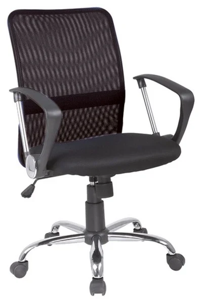 Otáčecí kancelářská židle má stabilní konstrukci z plastu a chromovaného kovu s prodyšným síťovaným opěradlem. Sedák a opěrák jsou potaženy membránovou tkaninou, která poskytuje komfort a odolnost.