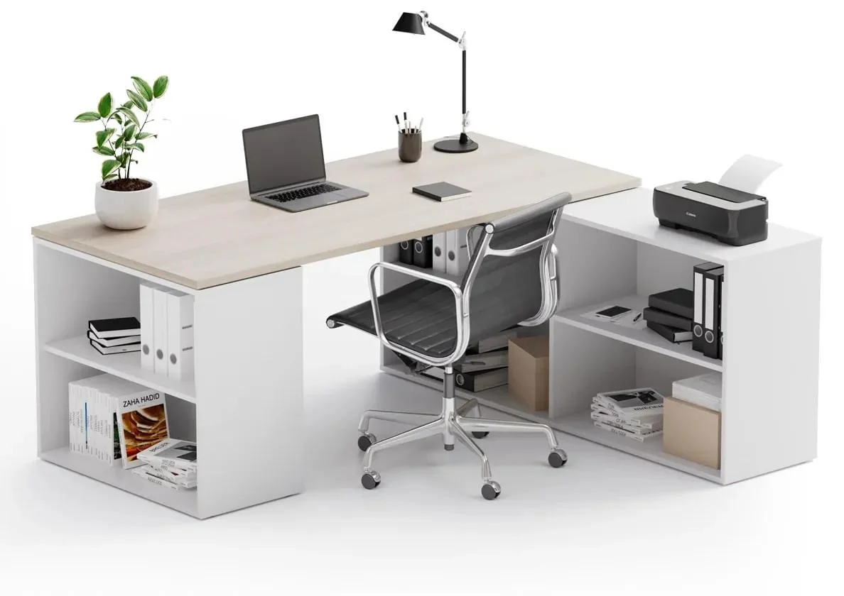 Vyroben z odolné laminované dřevotřísky o tloušťce 18 mm, vous získáte kvalitní a dlouhotrvající pracovní plochu. Varianty desek v přírodním dubu, grafitu a oranžové barevné úpravy umožňují snadné sladění s ostatními prvky kancelářského prostředí. Součástí sestavy jsou nejen prostorná pracovní plocha, ale také různé typy otevřených skříněk a kontejnery, které nabídnou dostatek úložného prostoru a přehlednosti. Tento praktický set je ideální pro vytváření funkčního a stylového pracovního místa v každé kanceláři nebo domácím studiu.