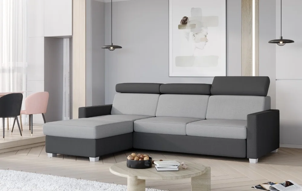 Rozkládací rohová sedačka KATMAI v levém provedení nabízí pohodlné sezení a praktické využití prostoru. Sedačka je k dispozici se dvěma látkovými variantami Malmo 90 (světle šedá) a Malmo 96 (tmavě šedá).