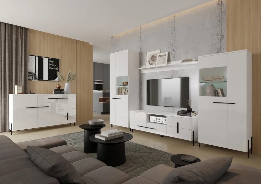 Rozměry jednotlivých prvků (šířka x výška x hloubka): komoda 150 × 91 × 40 cm; vysoká vitrína s LED osvětlením 70 × 200 × 40 cm; televizní stolek 150 × 52 × 40 cm; police 150 × 20 × 21 cm; nízká vitrína s LED osvětlením 70 × 158 × 40 cm. Korpus je proveden v bílé barvě, dvířka mají hladký bílý lesk, úchyty a nožky jsou černé. Materiál: korpus lamino, dvířka MDF/sklo a kovové nožky. Dodáváno v demontu. Navíc díky modulárnímu systému si jednoduše upravíte konfiguraci podle potřeby a prostoru.