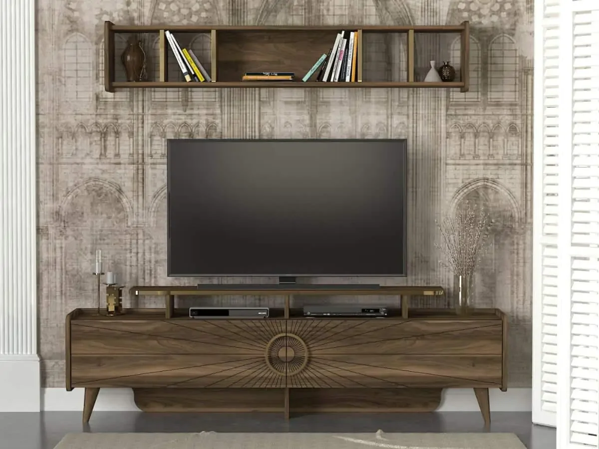 Televizní stolek KERSTIN vkusně spojuje netradiční vzhled dvířek s odolným povrchem z 18 mm laminátu s PVC hranou v dekoru ořech Vlašský, který dodá obýváku teplý a moderní nádech. Součástí setu je i praktická závěsná police ve stejném dekoru, která poslouží jako malá knihovna nebo odkládací prostor pro dekorace a drobnosti. Provedení lamina o tloušťce 18 mm zaručuje dlouhou životnost a snadnou údržbu. Díky širokému formátu stolku poskytuje dostatek místa pro televizi i praktické úložné plochy. Rozměry stolku: šířka 184 cm, výška 55 cm, hloubka 34 cm; rozměry závěsné police: šířka 154 cm, výška 30 cm, hloubka 22 cm. Dodáváme v demontovaném stavu.
