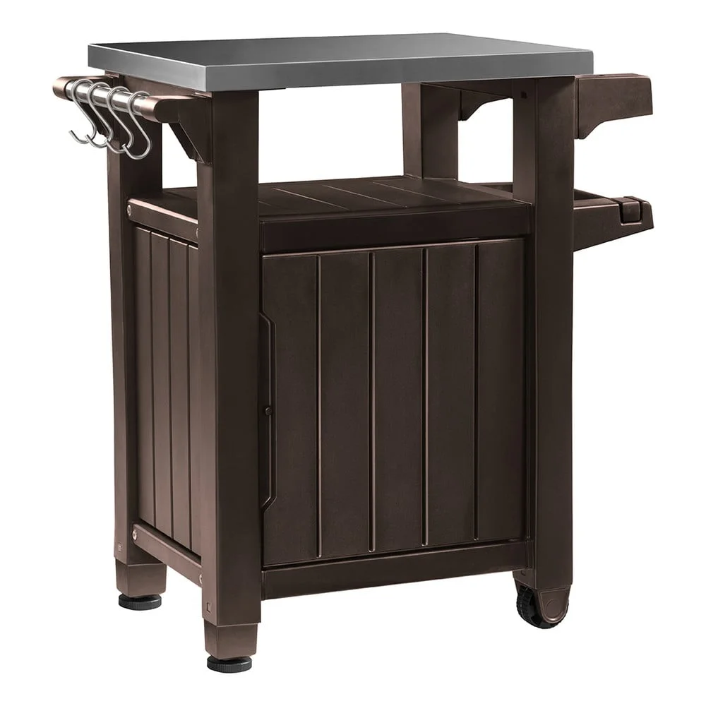 Stolní odkládací stolek od značky Keter je ideálním pomocníkem pro vaši venkovní kuchyni a grilování. Díky prostornému úložnému prostoru si snadno uskladníte všechny potřebné grilovací pomůcky a suroviny, což vám usnadní přípravu jídla.