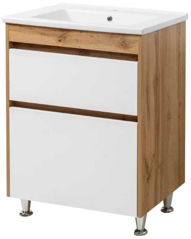Konstrukce z odolné dřevotřísky je doplněna elegantní povrchovou úpravou v matném dřevěném dekóru a lesklé bílé části boků, což dodává skříňce moderní vzhled. Součástí balení je vysoce kvalitní sanitární keramika umyvadla, které je navrženo tak, aby dokonale ladilo s celkovým designem. Umístění na nožičkách umožňuje snadnou údržbu a čistotu. Tento stylový kus nábytku s elegantním soft-close systémem je nejen praktický, ale i vizuálně atraktivní. Ideální volba pro ty, kteří hledají kombinaci funkčnosti, moderního vzhledu a kvalitního zpracování. Dopřejte své koupelně sofistikovaný vzhled a maximální komfort s tímto exkluzivním modelem.