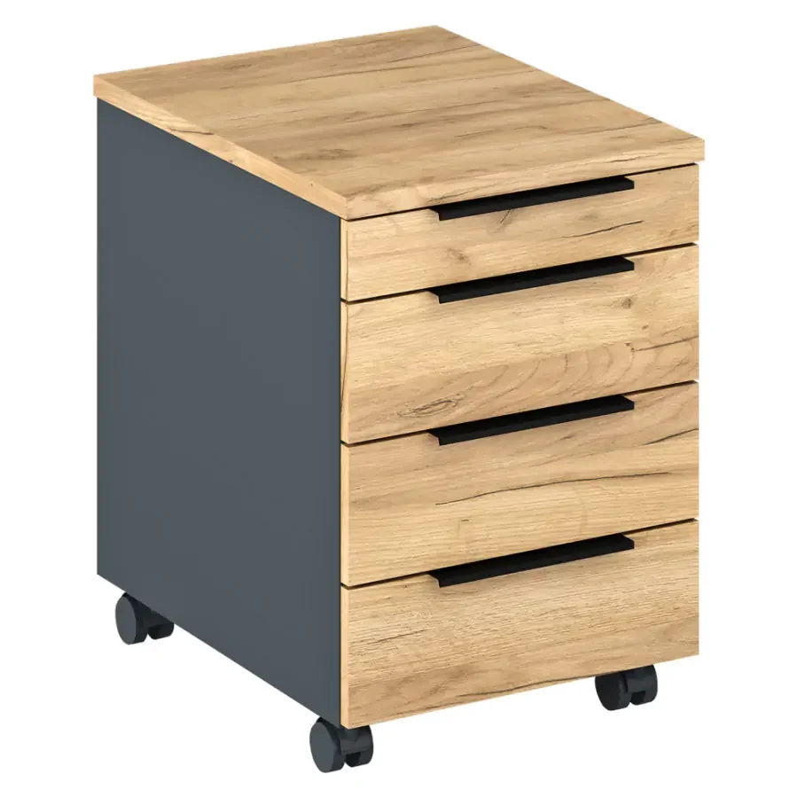 Vyznačuje se DTD laminovanou konstrukcí v kombinaci grafit/dub artisan; rozměry 43 x 56 x 61 cm, tloušťka materiálu 1,6–2,2 cm. Výška šuplíku činí 15,5 cm, šuplík s penálem má výšku 8 cm a nosnost každého šuplíku je 5 kg; kolečka jsou plastová, což zaručuje nízkou hlučnost při manipulaci. Dodáváno v demontu. Vytvořte si efektivní a příjemné pracovní prostředí díky modulárnímu kancelářskému sektorovému nábytku KLAUDIUS, který se hodí do menších i větších kanceláří.