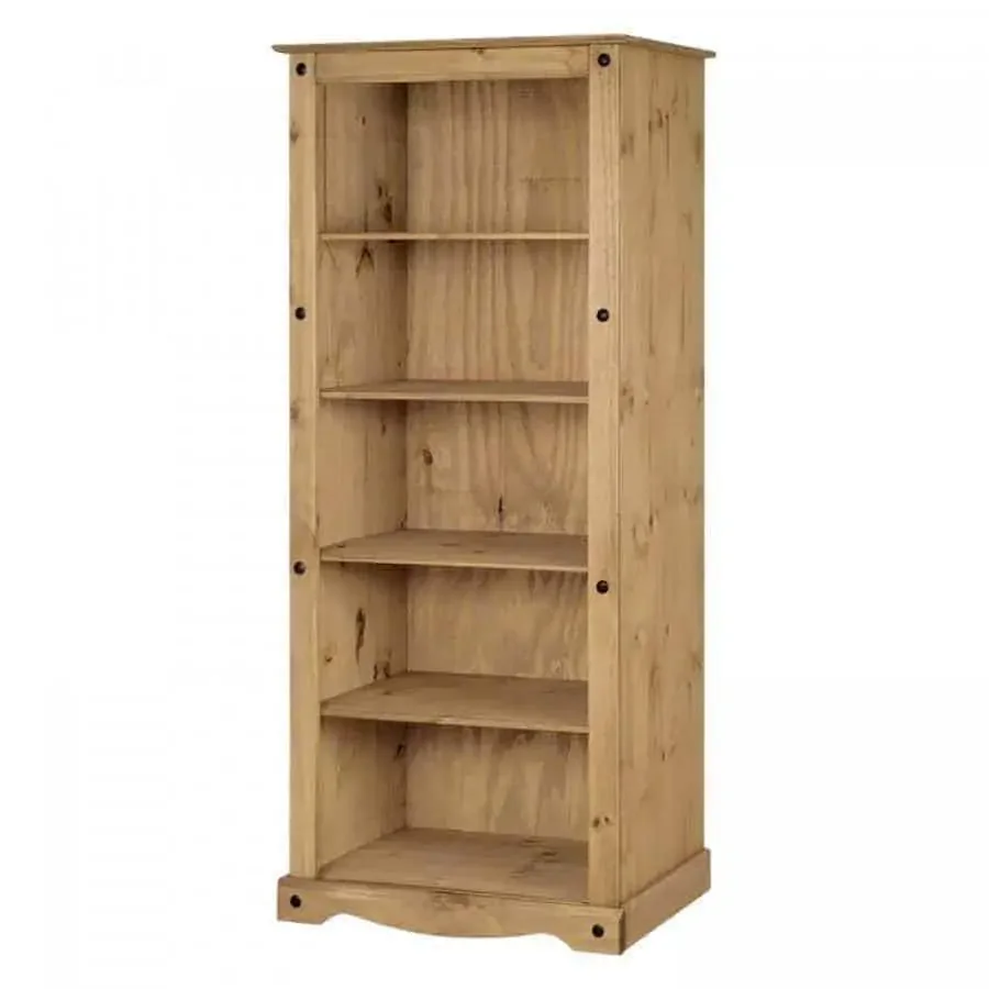 Knihovna CORONA 3 je vyrobena z masivního borového dřeva s voskovaným povrchem, který dodává nábytku teplý medový odstín a rustikální šarm. Její čtyři prostorné police nabízejí dostatek místa na knihy, šanony i dekorace.