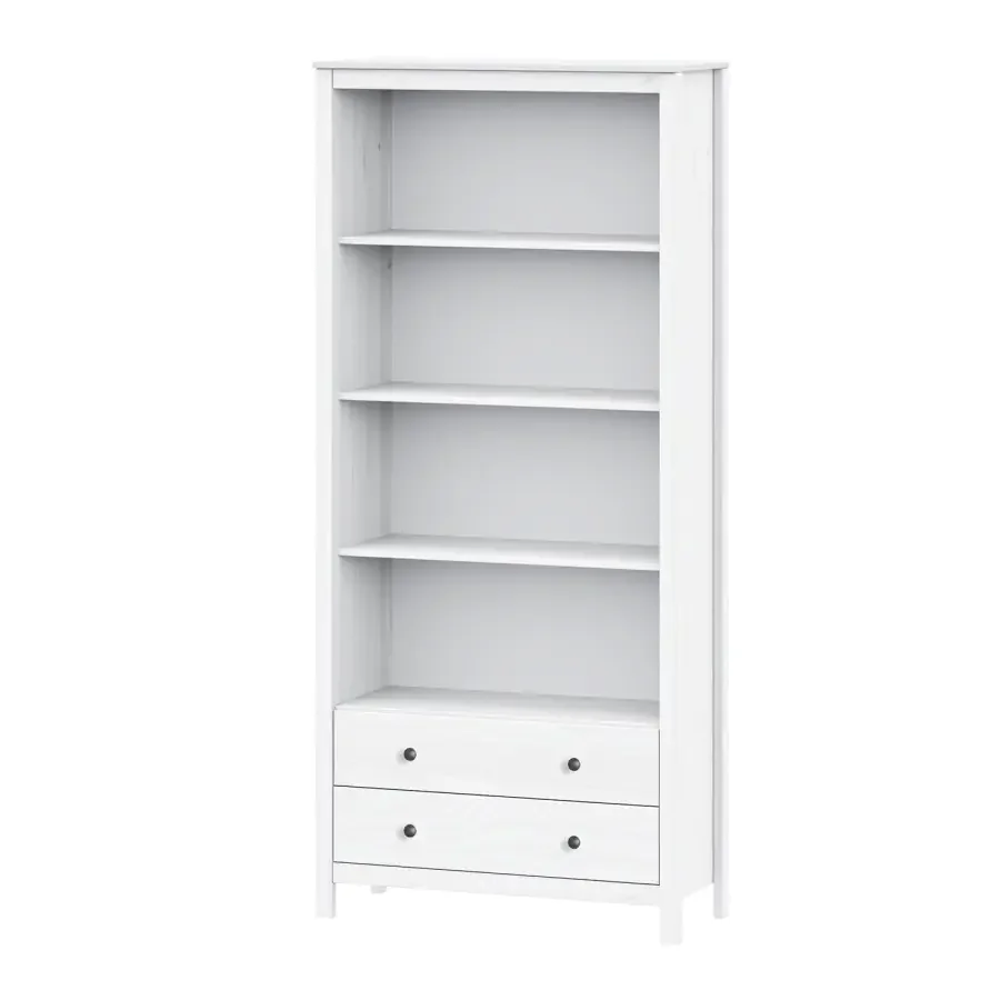 Knihovna TORINO nabízí dvě prostorné zásuvky a tři police pro pohodlné uskladnění knih, dokumentů a osobních věcí. masiv borovice zajišťuje pevný základ a odolný povrch, který dlouho vydrží. Díky bílé lakované úpravě působí elegantně a hodí se k mnoha interiérovým stylům. Rozměry knihovny jsou 85 cm na šířku, 37 cm na hloubku a 190 cm na výšku. Materiál: masiv borovice s bílým lakem; kovové úchytky a dva kovové pojezdy pro zásuvky zajistí pohodlné používání. Dodáváno v demontu. Je vhodná pro obývací pokoj, pracovnu, ložnici i dětský pokoj a nabídne praktický a stylový úložný prostor pro váš domov.