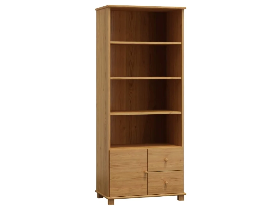 Kombinovaná knihovna s dvířky a dvěma šuplíky poskytuje praktické úložné prostory pro knihy i dekorace. Vyrobená z masivu borovice o tloušťce desky 2 cm, s mořením v odstínu olše, působí elegantně a nadčasově.
