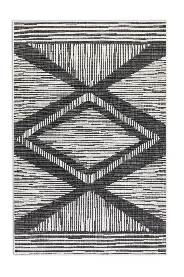 Kosočtverce a jemné proužky tvoří černo-bílý vzor, který zaujme v interiéru i na venkovních plochách. Krátké smyčky z polypropylenu zaručují vysokou odolnost, pevnost a snadnou údržbu. Koberec snáší vyšší zátěž a povětrnostní vlivy, je proto vhodný do haly i na terasu. Obšití po celém obvodu a certifikát zdravotní nezávadnosti zajišťují dlouhou životnost i bezpečné použití v domácnosti. Navíc se jednoduše čistí a rychle schne, což oceníte při běžném úklidu i častém venkovním provozu.