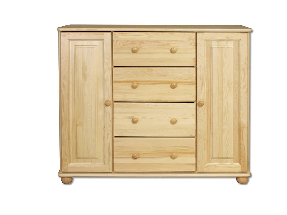 Masivní borovice dodává komodě pevnost a teplý přírodní vzhled. Barva je volitelná níže, materiál zůstává masiv borovice. Rozměry činí 118 cm na šířku, 100 cm na výšku a 47 cm do hloubky.