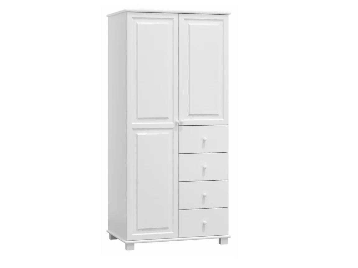 Kombinovaná šatní skříň s čtyřmi šuplíky je vyrobena z masivu borovice o tloušťce 2,6 cm a povrchově ošetřena bílým mořením. Rozměry: 190 cm (výška) × 80 cm (šířka) × 60 cm (hloubka). Dodáváno v demontu; montáž je snadná a rychlá. Pevná konstrukce z borovice zajišťuje dlouhou životnost a světlá bílá barva opticky zvětšuje prostor, což usnadní sladění s různým nábytkem. Díky prostorovým šuplíkům nabídne přehledné uspořádání oblečení a doplňků, skříň je tak praktickou volbou pro každou domácnost.