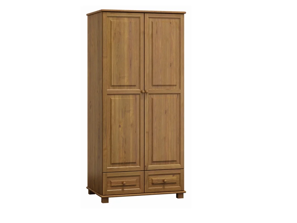Kombinovaná šatní skříň s dvěma zásuvkami je vyrobena z masiv borovice, tloušťka stěn 2,6 cm zajišťuje stabilitu a dlouhou životnost. Povrch je mořený do odstínu dub, který skříni dodává teplý a nadčasový vzhled. Rozměry: výška 190 cm, šířka 90 cm, hloubka 60 cm. Dodáváno v demontu pro pohodlnou přepravu a rychlou montáž.