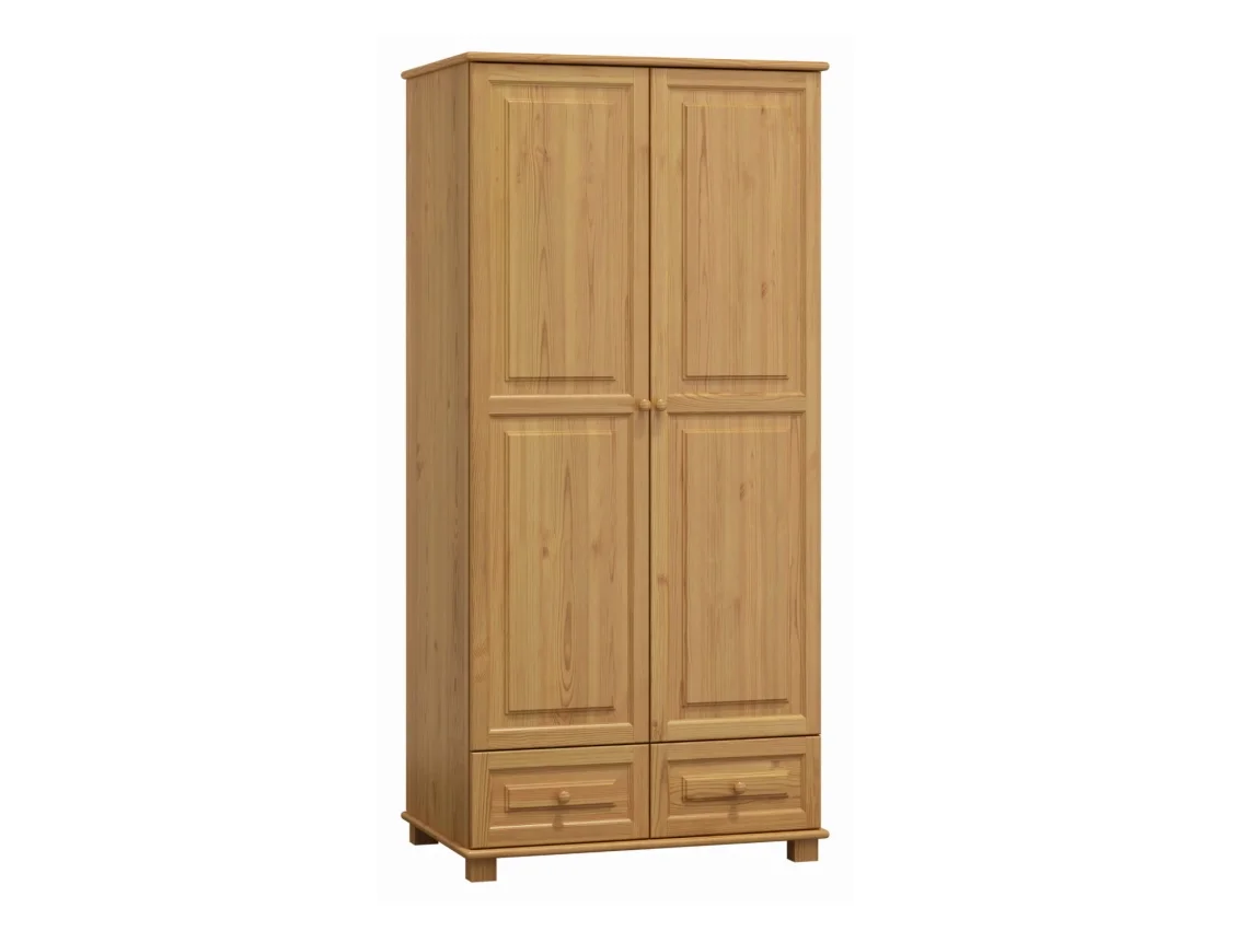 Kombinovaná šatní skříň BHAGIRA 5 je vyrobená z masivní borovice a svou tloušťkou 2,6 cm garantuje stabilitu i dlouhou životnost. Povrch má moření v odstínu olše, který dodává interiéru teplý a nadčasový vzhled. Rozměry 190 x 80 x 60 cm (výška x šířka x hloubka) poskytují dostatek místa pro uložení oděvů, doplňků a sezonních věcí. Vnitrní uspořádání zahrnuje dva praktické šuplíky pro drobnosti. Skříň je dodávána v demontu, montáž je jednoduchá a rychlá.
