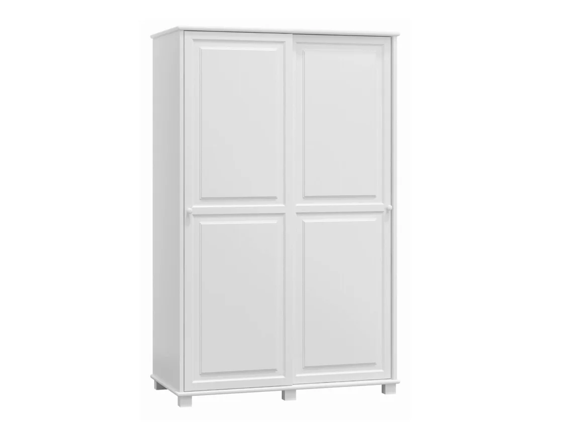 Moderní šatní skříň s dveřmi, které se posouvají, je vyrobena z masivní borovice a má tloušťku 2,6 cm v provedení bílého moření. Rozměry 190 cm na výšku, 133 cm na šířku a 60 cm do hloubky poskytují dostatek místa pro vaše oblečení.