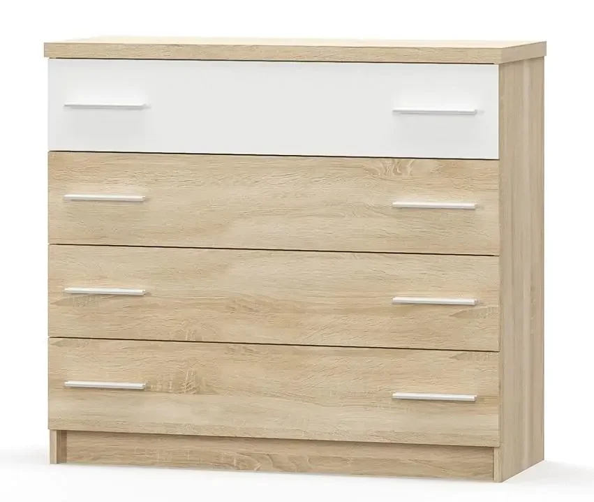 Elegantní komoda se 4 zásuvkami v kombinaci dub sonoma a bílé prvky skvěle doplní moderní interiér. Je vyrobená z kvalitní LTD desky o tloušťce 1,6 cm, což zajišťuje pevnost a dlouhou životnost. Sektorová řada umožňuje sestavit nábytek do ložnice či studentského pokoje podle vlastních představ. Dodáváme v demontovaném stavu, což usnadňuje dopravu a montáž. Praktická volba pro organizaci drobných věcí díky čtyřem zásuvkám a nadčasovému designu, který se hodí do různých stylů.