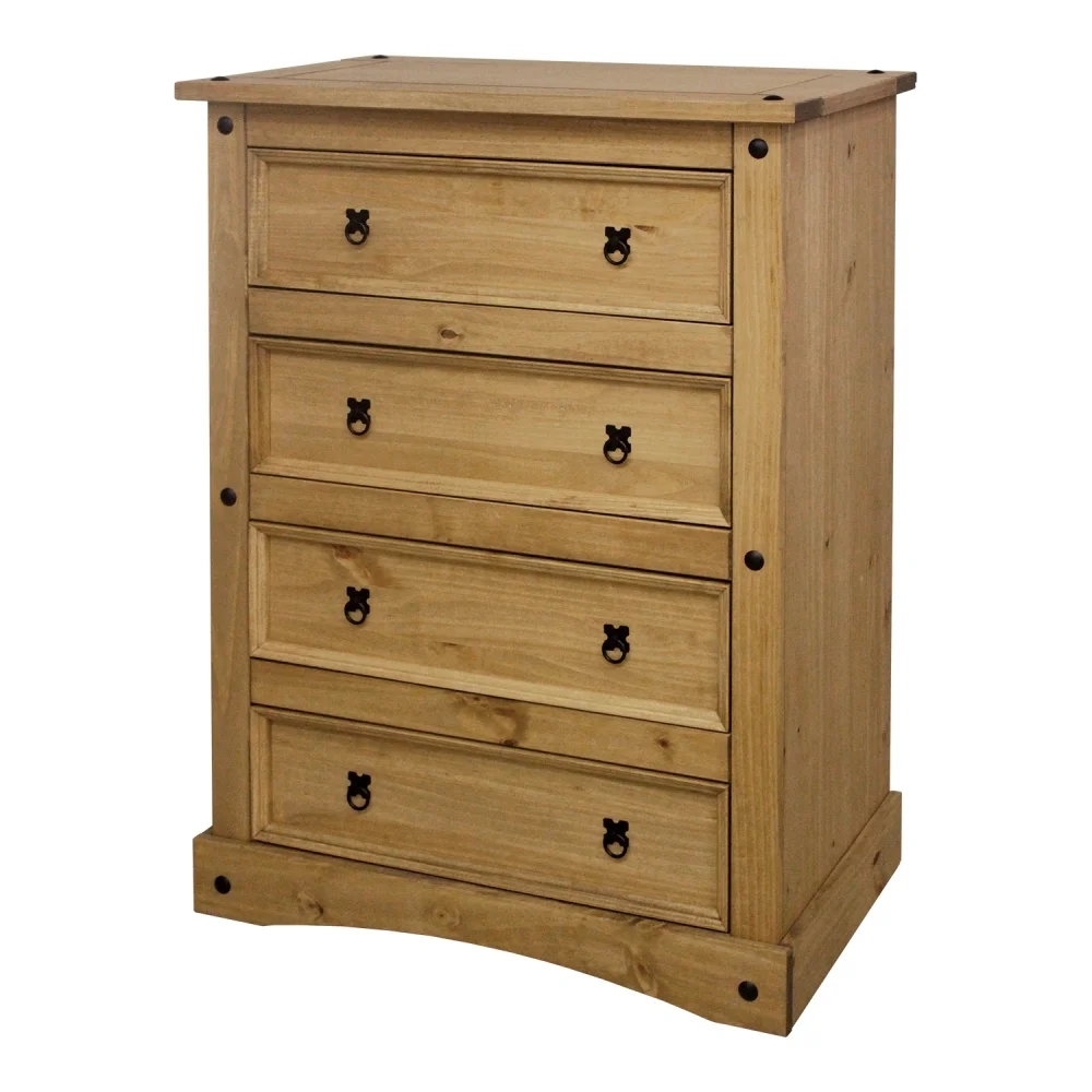Masivní komoda z borovice s voskovaným povrchem v teplém medovém odstínu spojuje přírodní krásu s praktickým designem. Čtyři prostorné zásuvky poskytují dostatek místa pro uložení oblečení a drobných věcí.