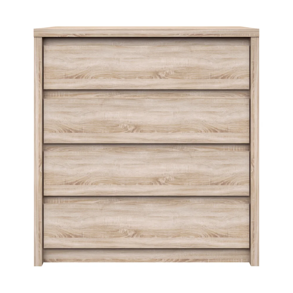 Materiál z DTD laminované desky zajišťuje odolnost a snadnou údržbu každodenního používání. Provedení v barvě dub sonoma působí čistě a moderně. Rozměry komody jsou 87 cm (šířka) x 40 cm (hloubka) x 92 cm (výška); horní deska má tloušťku 3,2 cm a zbylé části 1,6 cm, což dodává nábytku pevnou konstrukci. Čtyři šuplíky s výškou 17 cm nabízejí dostatek místa pro třídění věcí. Pro bezpečnost a stabilitu doporučujeme připevnit nábytek ke zdi, a dodáváme ho v demontu pro pohodlnou montáž a přepravu.