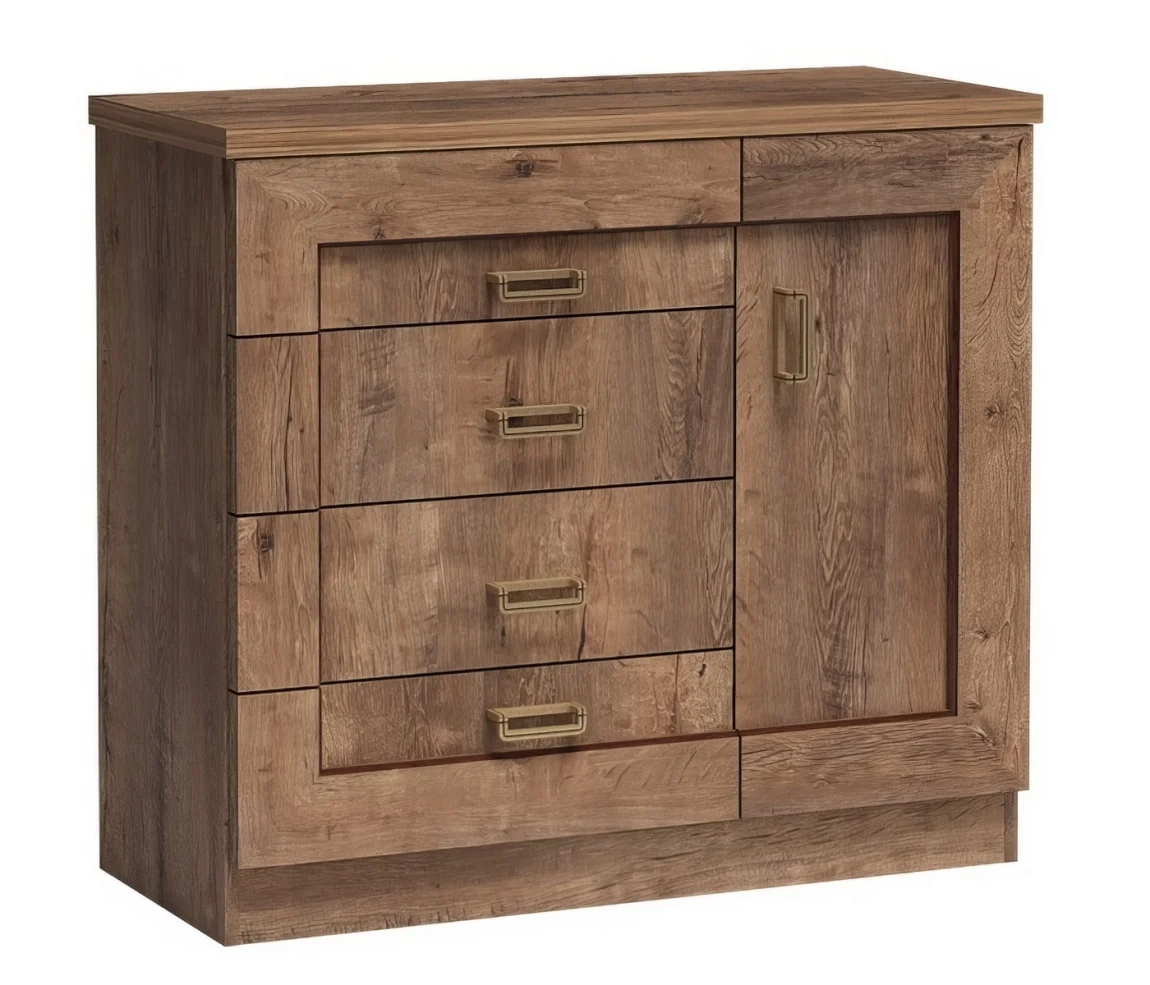 Stylová komoda ze sektorové řady ACHAO přináší praktické uspořádání a nadčasový vzhled v dekoru dub Lefkas. Má dvířka a čtyři zásuvky pro přehledné ukládání a za dveřmi se nachází police pro větší organizaci. Horní deska je zesílena na 32 mm a čelo nábytku zdobí MDF lišty s ABS hranami pro odolnost a dlouhou životnost. kvalitní LTD o tloušťce 16 mm zajišťuje pevnost a stabilitu při každodenním používání. Dodáváme v demontovaném stavu pro snadnou montáž a transport. Celá kolekce v duchu vintage spojuje eleganci s praktickým tvarem a efektivně tak využije každý kout vašeho domova.