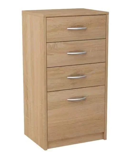 Praktická komoda s 4 zásuvkami nabízí dostatek úložného prostoru pro ložnici, předsíň i obývací pokoj. Její výrazný vzhled vychází z jasně viditelné dřevěné struktury, která interiéru dodá moderní vzhled. Korpus i čela zásuvek tvoří laminovaná dřevotříska v odstínu dub sonoma, materiál je odolný vůči vysokým teplotám, poškrábání a nárazům a je zakončen ABS hranou. Zásuvky se pohybují po kovových pojezdech s plastovými kolečky a jejich úchyty jsou z plastu. Dodáváme v demontovaném stavu, což usnadňuje přepravu i montáž. Materiál je snadno udržovatelný a povrch se běžnými čisticími prostředky spolehlivě čistí. Díky neutrálnímu dekoru dub sonoma ji lze snadno sladit s různými styly interiéru a skvěle doplní další kusy ze série AGNES/HIT.