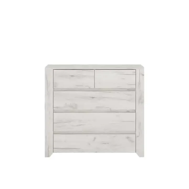 Toto je komoda ze systému ANGEL, typ 43, která nabízí pět zásuvek a hodí se do dětských i studentských pokojů. Díky svému neutrálnímu vzhledu ji snadno sladíte s dalším nábytkem i do ostatních interiérů. Je vyrobena z laminované dřevotřísky v provedení bílá craft, což zajišťuje snadnou údržbu a dlouhou životnost. Zboží je dodáváno v demontu, takže přeprava a skladování jsou pohodlnější.
