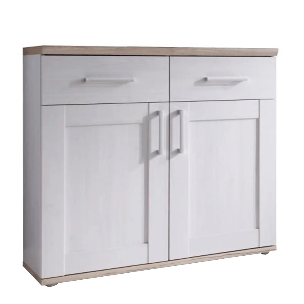 Kombinovaná komoda ANGELIT v čisté bílé barvě s dekorem dub Sanremo vnese do vašeho domova jemný provensálský nádech. Dvoudveřová skříň ukrývá dvě police a k tomu patří 2 praktické šuplíky, zatímco vrchní deska poskytuje širokou odkládací plochu pro dekorace.