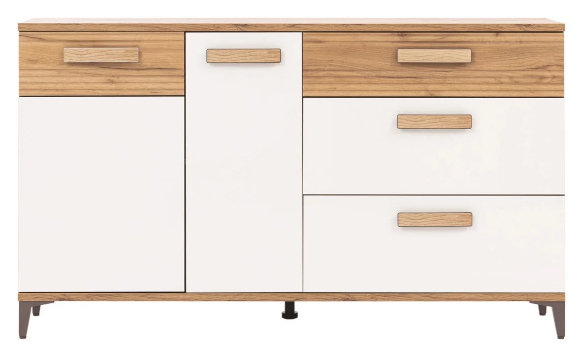 Komoda ANTIOPE 2D3S přináší moderní design a praktické řešení pro úschovu. Korpus je v provedení dub craft zlatý a dvířka kombinují dub craft zlatý s bílým alpským leskem, což vytváří svěží kontrast do moderního interiéru.
