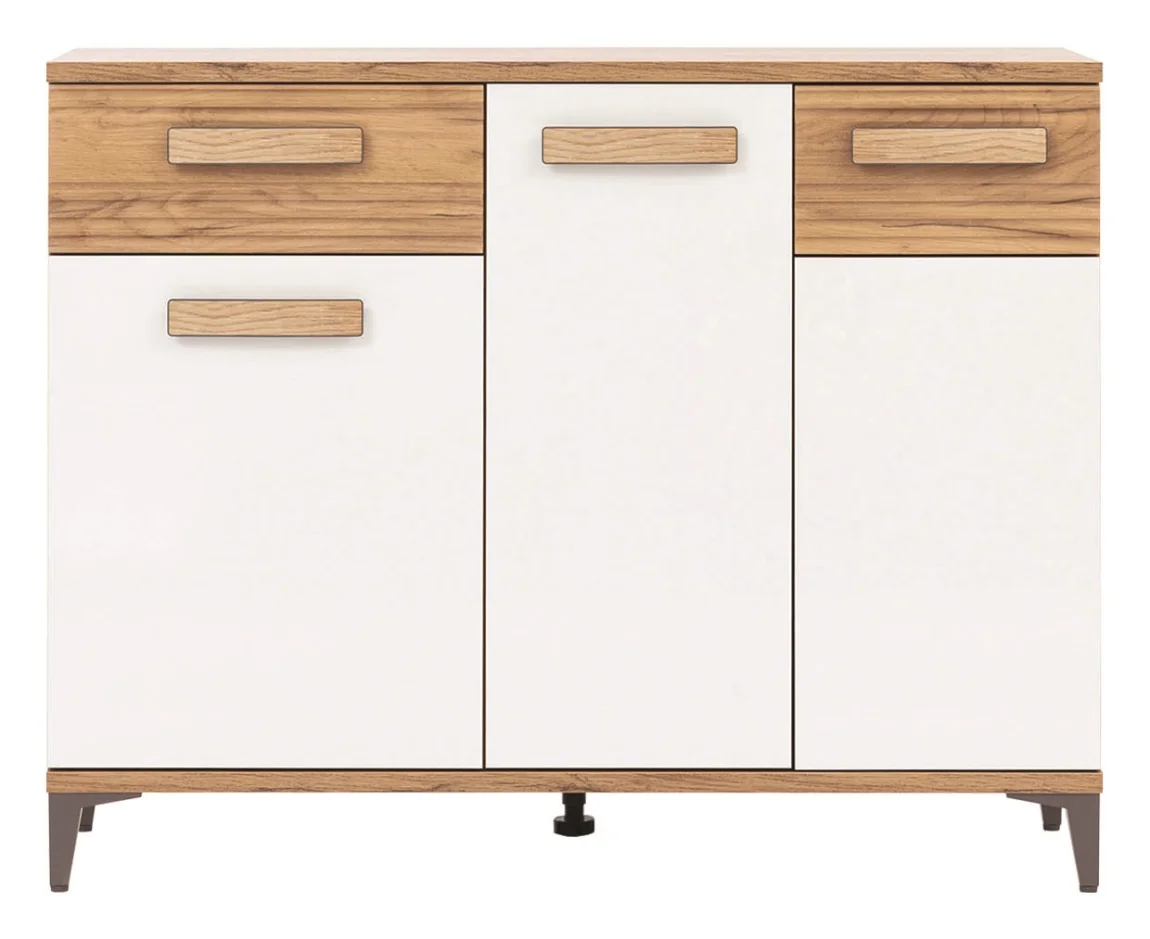 Kombinovaná komoda ANTIOPE 3D1S v elegantní kombinaci korpusu v dub craft zlatý a dvířek v dub craft zlatý/bílý alpský lesk efektně doplní každý moderní interiér. Rozměry 114 x 90 x 39,5 cm a konstrukce z lamina a MDF zajišťují pevnost i dlouhou životnost; korpusy mají tloušťku 16 mm, vrchní desky 22 mm a ABS hrany 0,5–1,5 mm.