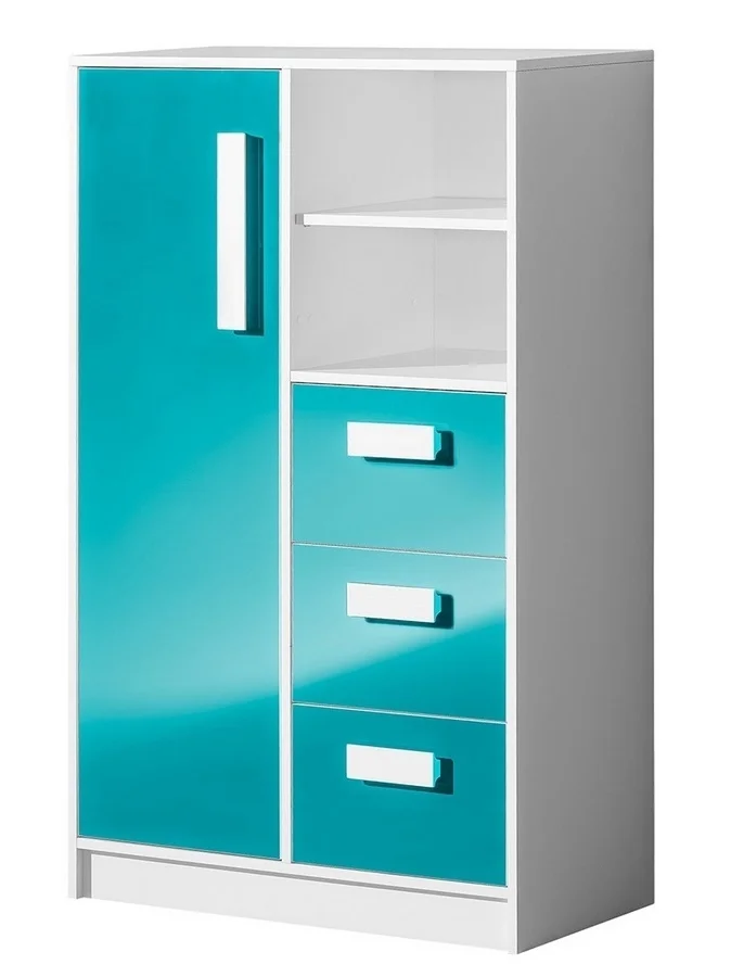 Elegantní Komoda BLOURT 1D3S nabízí tři zásuvky a otevřenou polici, poskytující praktický úložný prostor s moderním vzhledem. Korpus je v bílé matné barvě, zatímco dvířka jsou tyrkysově lesklá, což působí svěže a mladistvě.