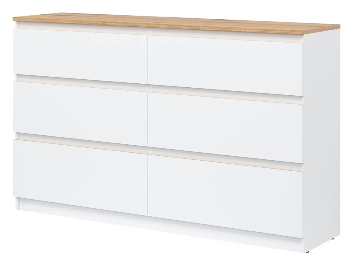 Elegantní komoda s šesti zásuvkami z řady BORROMEO 6S. Provedení v kombinaci bílé barvy a dubového odstínu Evoke působí svěže a nadčasově. Lamino s odolným povrchem zajišťuje snadnou údržbu a dlouhou životnost.