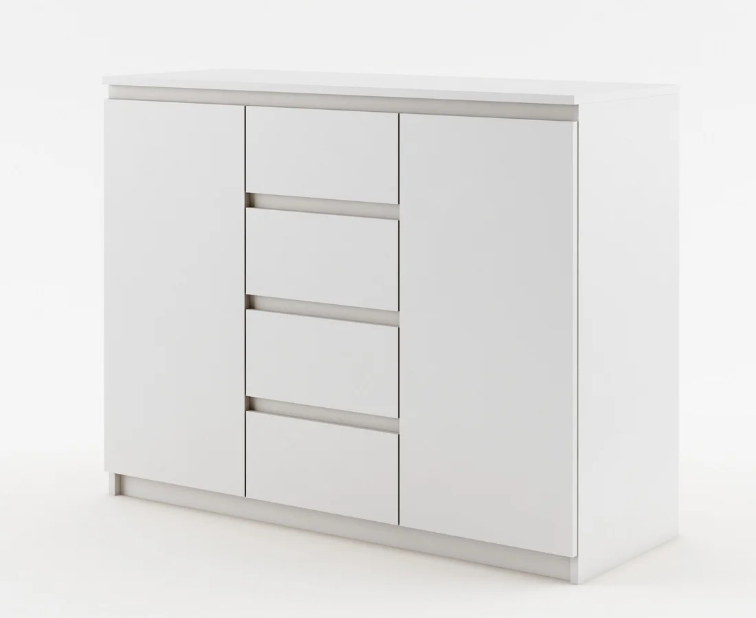 Komoda BREIZ 04 s dvěma dveřmi a čtyřmi zásuvkami se hodí do moderních interiérů a nabídne praktický úložný prostor. Je vyrobená z kvalitního LTD v bílé barvě, která je odolná vůči vysokým teplotám, poškrábání i nárazům.