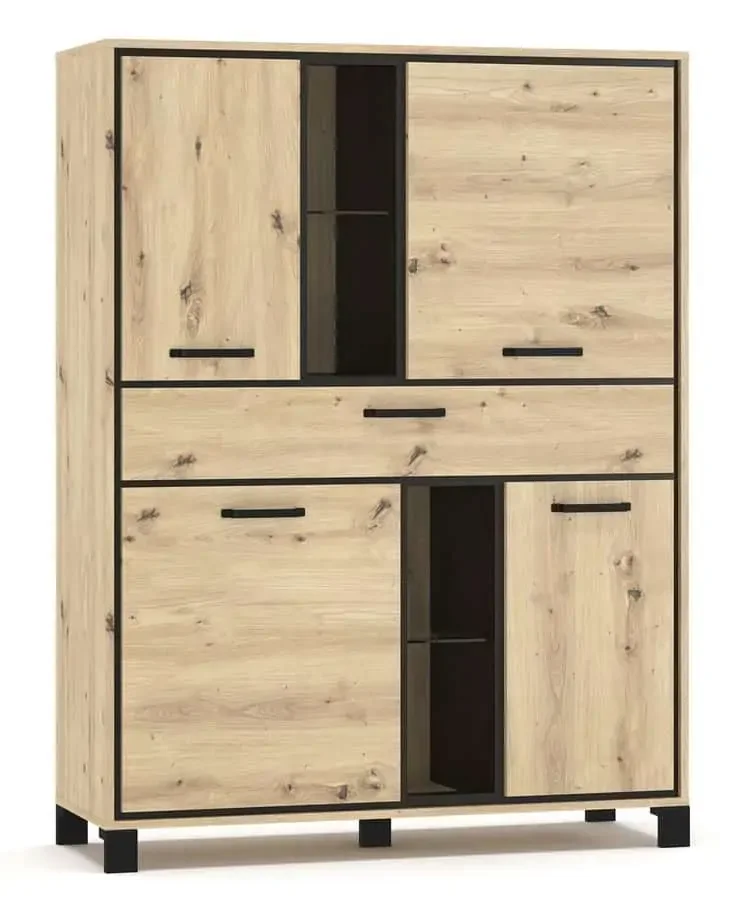 Elegantní komoda BUCKET s čtyřdveřovým provedením a jednou zásuvkou v moderním dekoru kombinujícím dub artisan a tmavý wenge, která dohromady tvoří nadčasový vzhled. Vyrobena je z kvalitní LTD desky, která garantuje pevnost povrchu a dlouhou životnost.