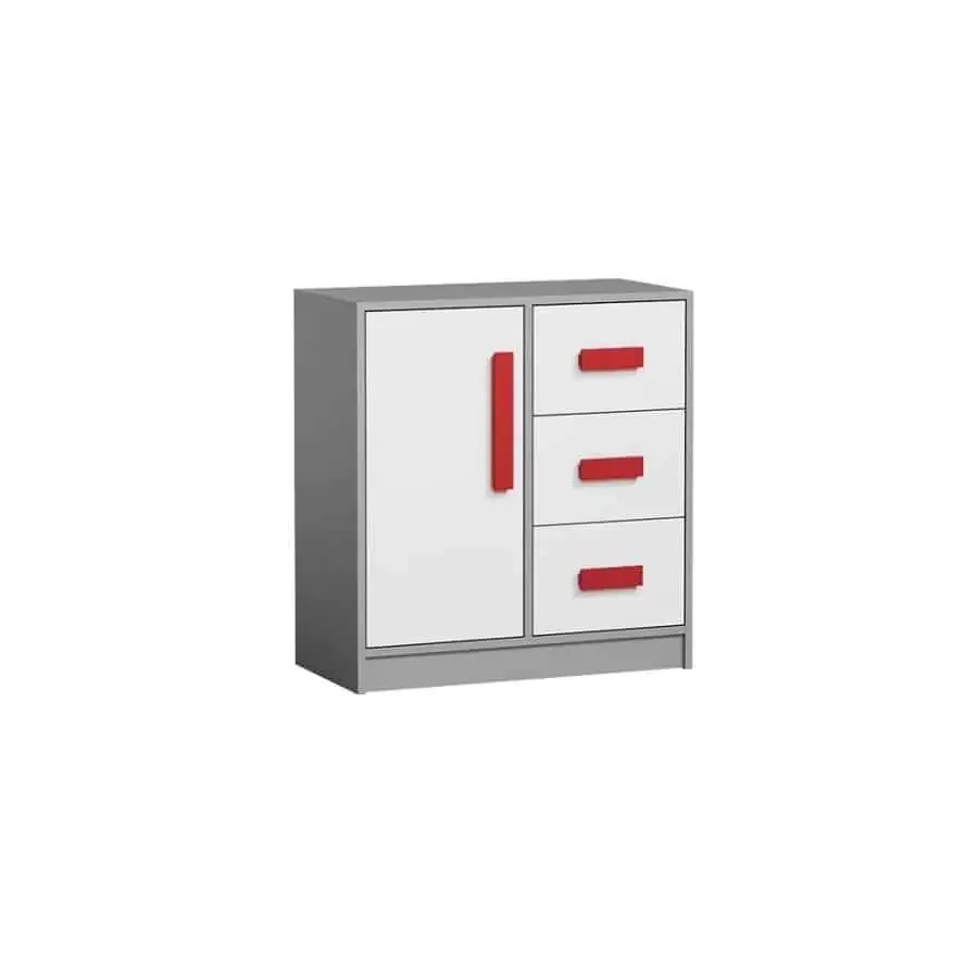 Nízká komoda ze série GYT kombinuje netradiční barevné řešení a originální úchytky, které dodají pokoji svěží šmrnc. Je vyrobena z kvalitní LTD desky s ABS hranami, což zajišťuje dlouhou životnost a snadnou údržbu. Korpus v antracitové šedé, dvířka v matné bílé a výrazné červené úchytky vytvářejí moderní kontrast vhodný pro mladší generaci. Sektorový systém GYT nabízí širokou škálu modulů, díky nimž si jednoduše sestavíte dětský nebo studentský pokoj, ložnici či kancelář podle vlastních představ. Dodáváme v demontovaném stavu, montáž je jednoduchá a zvládne ji téměř každý. Navíc díky konzistentní barevné kombinaci se komoda hodí k různým stylům interiéru a skvěle doplní další prvky série GYT.