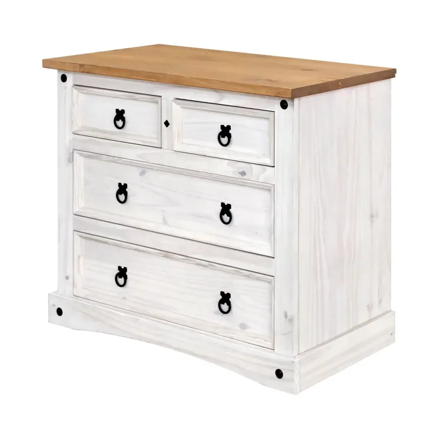 Komoda CORONA nabízí uspořádání 2+2 zásuvek a je vyrobena z masivního borového dřeva s voskovanou bílou povrchovou úpravou. Čtyři prostorné zásuvky pojmou drobnosti i dokumenty a udrží pořádek ve vašem domově. Tento kus se hodí nejen k ukládání, ale i k vystavení oblíbených doplňků, knih či drobných dekorací. Výrazné černé úchytky dodávají nábytku charakter a vymezují jeho styl. Díky pevnému zpracování a snadné údržbě voskové úpravy zůstanete s produktem spokojeni i po letech. Skvěle se hodí do moderního, skandinávského i tradičního interiéru a bude působit jako středobod místnosti.