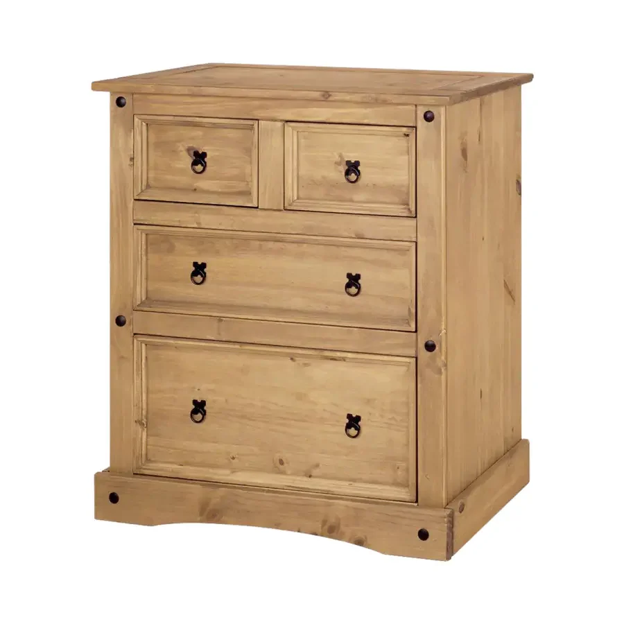 Komoda CORONA 3 z masivní borovice v medovém odstínu přináší styl starého nábytku a zároveň nabízí praktické úložné řešení do obývacího pokoje či chodby. Úložný prostor zajišťují dvě malé a dvě větší zásuvky, které pohodlně pojmou drobnosti i dokumenty.