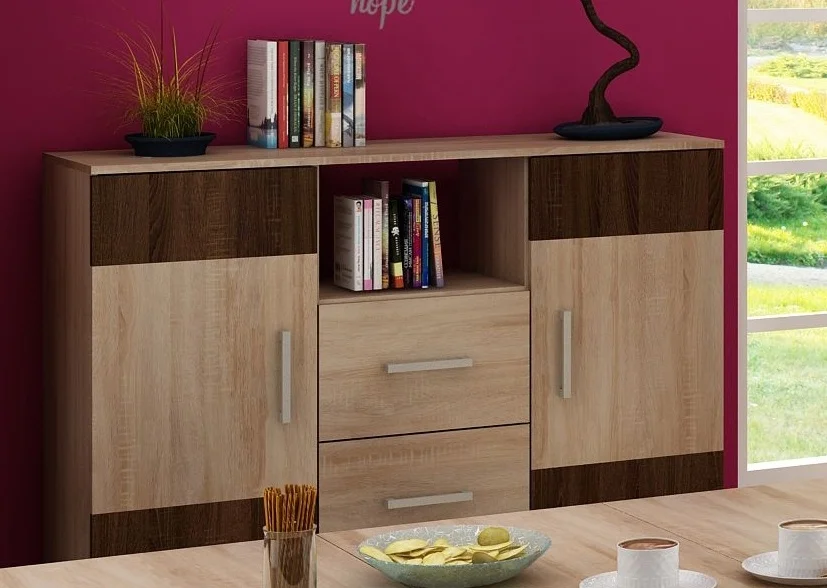 Komoda DAMARA v dvoubarevném provedení dub sonoma – světlý a tmavý odstín dodá interiéru moderní vzhled a pořádek. Je vyrobena z laminovaného materiálu 16 mm s ABS hranami o tloušťce 0,6 mm, což zajišťuje vysokou odolnost a snadnou údržbu.