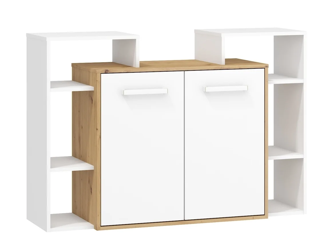 Prostorná komoda v kombinaci dub artisan a bíle dekorovaným povrchem se hodí do moderních i tradičních interiérů. Rozměry: šířka 127 cm, výška 86 cm, hloubka 41 cm. Vyrobena z LTD desky s ABS hranami pro dlouhou životnost a snadnou údržbu.