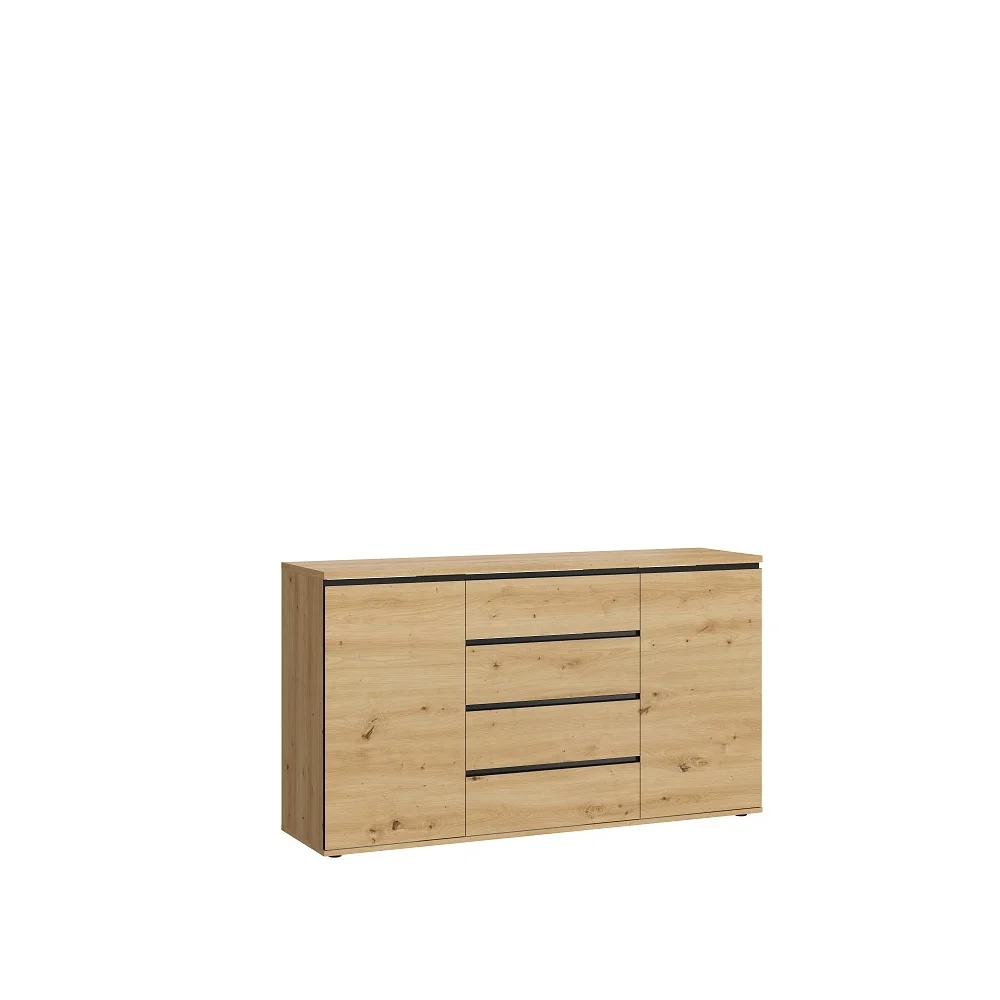 Široká komoda s bezúchytovým systémem otevírání a jemným tichým dovíráním poskytuje plynulý chod a čistý vzhled do každé místnosti. Provedení v dekoru dub artisan kombinuje odolné lamino s přírodním vzhledem, který snadno sladíte s dalším nábytkem.