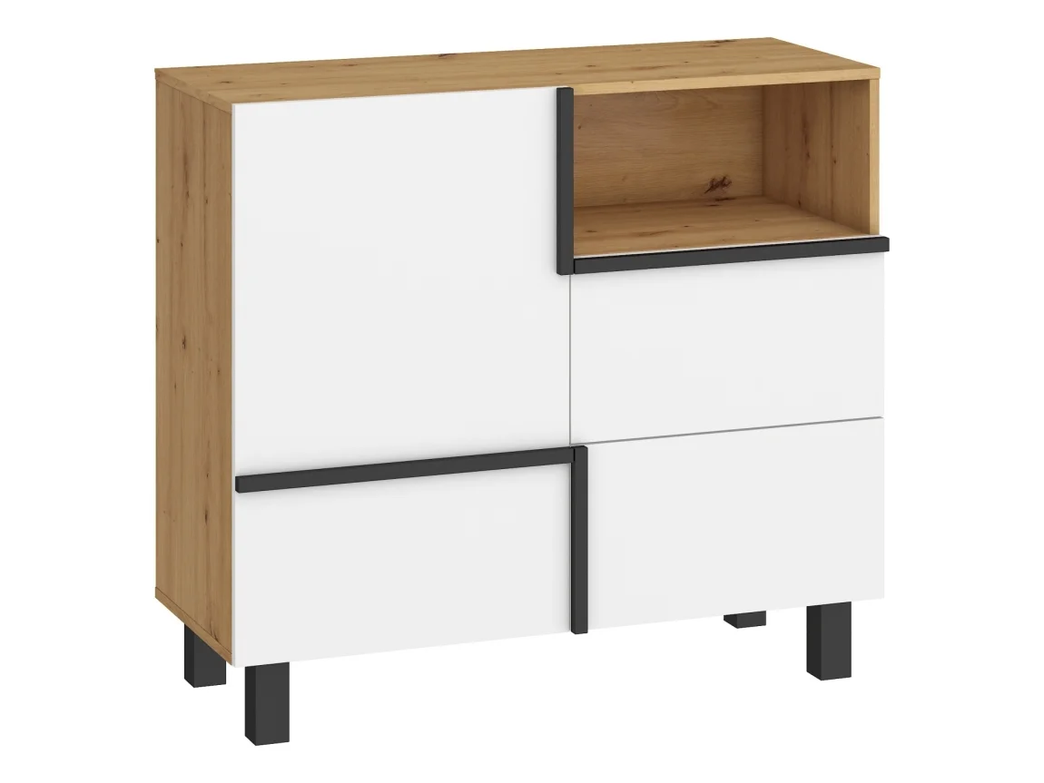 Stylová komoda DZENGAL 1D2S v provedení dub artisan s bílými prvky a černými lištami dodá interiéru nadčasový vzhled. Uvnitř najdete dvířka a dvě zásuvky, rozměry 100 x 90 x 42 cm a výšku nožek 12 cm pro lepší vzdušnost a snadnější údržbu.