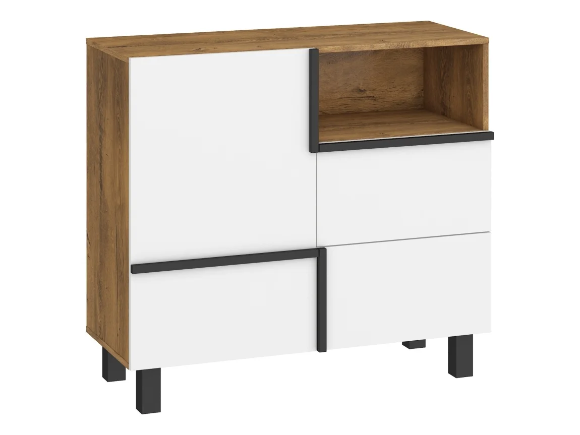 Praktická komoda DZENGAL 1D2S nabízí dvě dvířka a dvě zásuvky pro přehledné uspořádání věcí. Provedení kombinuje dub burgundský s bílou, doplněné černými lištami a nožkami pro moderní vzhled.