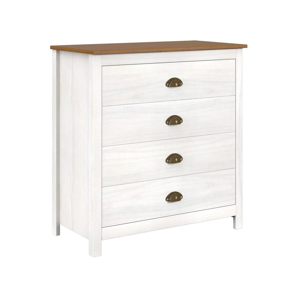 Elegantní komoda z masivní borovice s 4 zásuvkami ve rustikálním stylu. Barva kombinuje bílé odstíny s teplou hnědou, což vytváří vkusný venkovský look vhodný do obýváku i ložnice. Rozměry 80 × 85 × 41 cm a kvalitní zpracování z masivu zajišťují pevnost a dlouhou životnost.