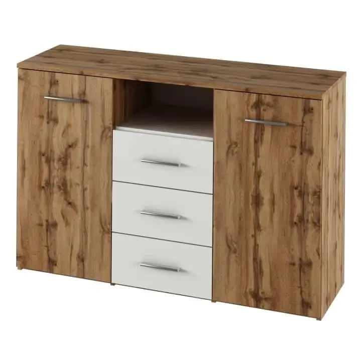 Komoda Gabriela je dvoudveřová skříňka s třemi zásuvkami v moderní dvoubarevné úpravě dub wotan / bílá. Laminovaná DTD povrchová úprava zaručuje snadnou údržbu a vysokou odolnost proti poškození. Za dvířky se ukrývá dostatek místa pro uložené předměty a tři zásuvky doplňuje praktická otevřená police pro rychlý přehled. Rozměry 120 × 80 × 38 cm poskytují zajímavý úložný prostor, aniž by komoda působila těžce. Dodáváme v demontovaném stavu, což usnadňuje přepravu a montáž, a díky kvalitnímu zpracování poskytuje dlouhodobou spolehlivost.