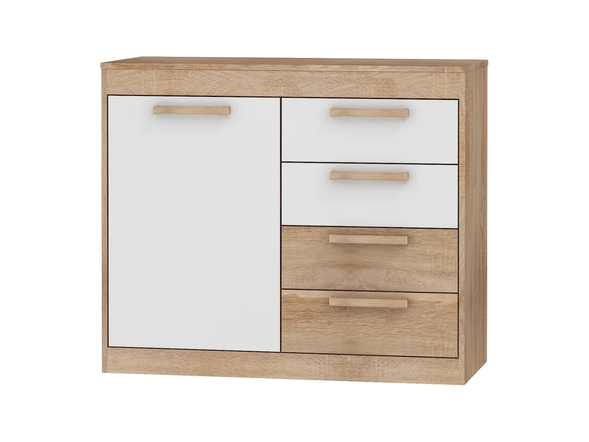 Stylová komoda GATTON 1D4S kombinuje dub sonoma s bílým leskem pro moderní vzhled a praktické řešení úložných prostor. Tiché zavírání dvířek a zásuvek zajišťuje plynulý a tichý provoz.