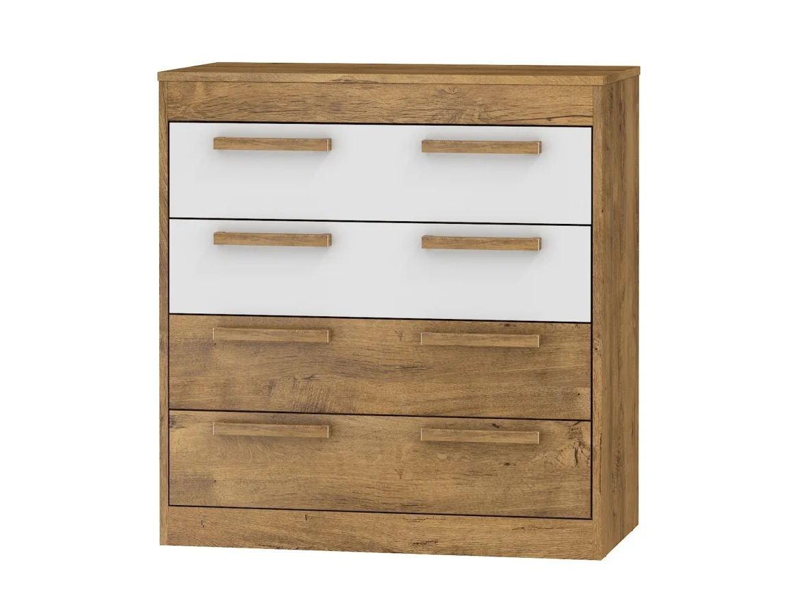 Komoda se čtyřmi zásuvkami v dezénu dub burgundský a s bílým leskem nabízí praktické úložné řešení pro ložnici i obývací prostor. Rozměry: 80 x 85 x 44 cm (š x v x h). Materiál: LTD s ABS hranami pro vyšší odolnost a dlouhou životnost.