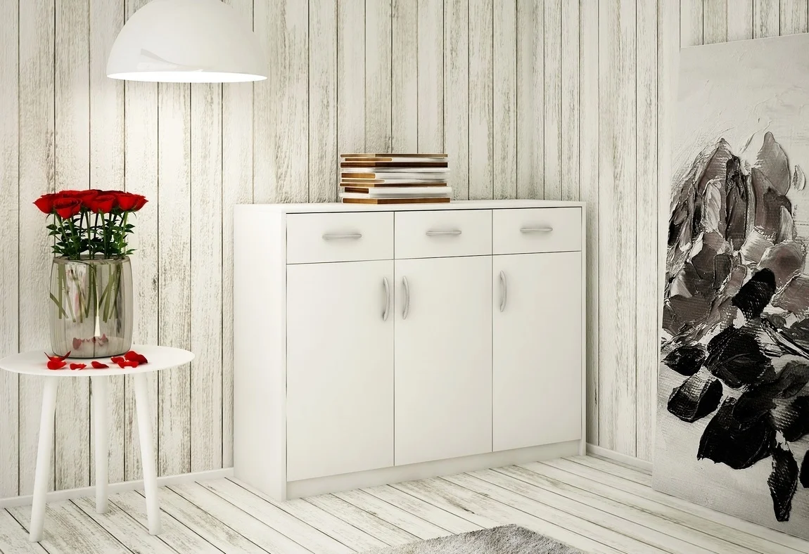 Komoda GELLERT 3D3S v elegantním bíle matném provedení nabízí praktické řešení pro úložný prostor díky třídveřové konstrukci a třem zásuvkám. Korpus i dvířka jsou vyrobeny z kvalitní LTD v bílé matné barvě, která odolává vysokým teplotám, poškození a nárazům a je doplněná ABS hranou pro dlouhou životnost. Viditelná struktura dřeva dodává nábytku moderní vzhled a příjemný dojem. Zásuvky pohání kovové pojezdy s plastovými kolečky, které zajišťují tichý a plynulý chod. Rozměry: výška 85 cm, šířka 110 cm, hloubka 35 cm. Dodáváno v demontu, záruka 24 měsíců.