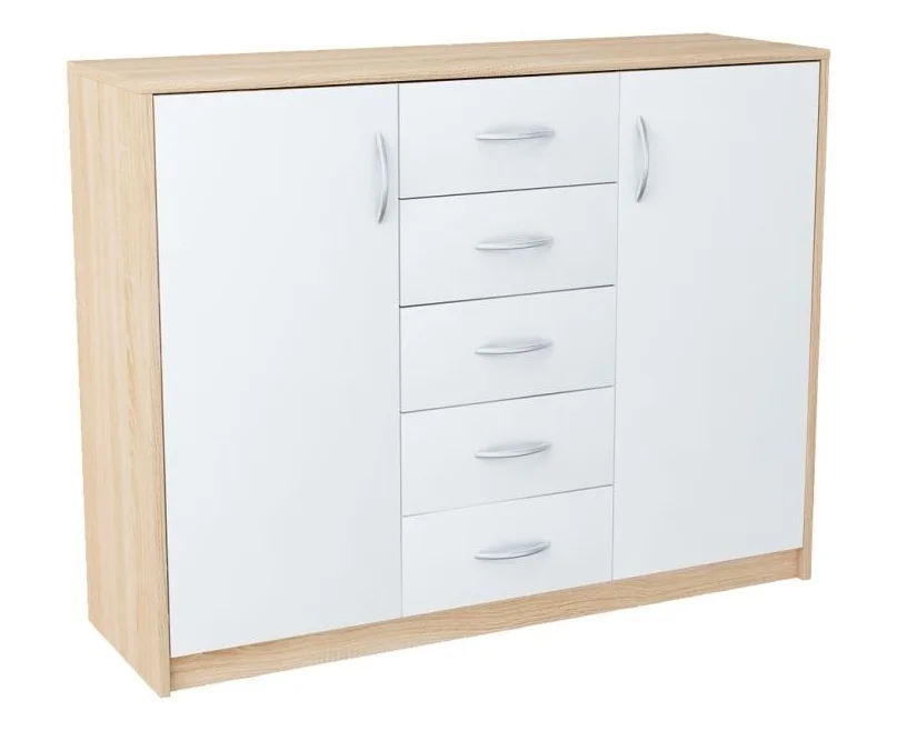 Tento model představuje moderní dvoudveřovou komodu s pěti zásuvkami, která nabízí praktický úložný prostor. Korpus i dvířka jsou vyrobeny z odolného lamina LTD v kombinaci odstínu dub sonoma a bílé, a hrany jsou opatřeny ABS páskou pro dlouhou životnost.