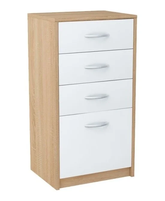 Stylová komoda se čtyřmi zásuvkami je praktickým a moderním doplňkem do každého interiéru. Korpus i čela zásuvek jsou vyrobeny z LTD lamina v dezénu dub sonoma/bílá, povrch je odolný vůči teplu, poškrábání a nárazům a hrany jsou opatřeny ABS páskou pro dlouhou životnost. Nápadnou strukturu dřeva na povrchu lze snadno ocenit na první pohled. Zásuvky se pohybují po kovových pojezdech s plastovými kolečky, což zajišťuje hladký a tichý chod. Rozměry: výška 85 cm, šířka 45 cm, hloubka 35 cm; dodáváno v demontu a se zárukou 24 měsíců. Tato komoda je díky svým kompaktním rozměrům ideální pro menší prostory a zároveň nabídne dostatek úložného prostoru; navíc díky jednoduchému sestavení ji rychle uvedete do provozu.