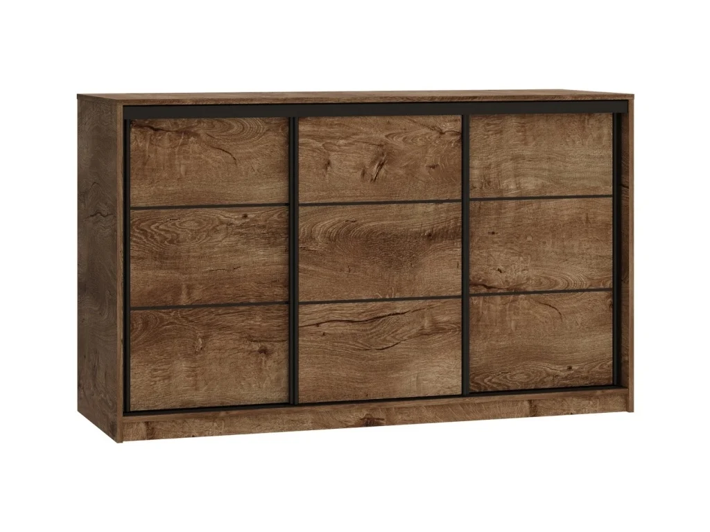 Kombinovaná šatní komoda s posuvnými dveřmi nabízí efektivní úložný prostor. Rozměry (š x v x h): 160 × 97 × 56 cm. Vyrobena z lamina v odstínu dub Lefkas, díky kterému působí interiér svěže a moderně.